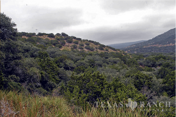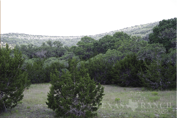 This beautiful Hill Country ranch has hills, canyons and scenic views from the elevated plateaus of the bluff sides. It is covered with a good mix